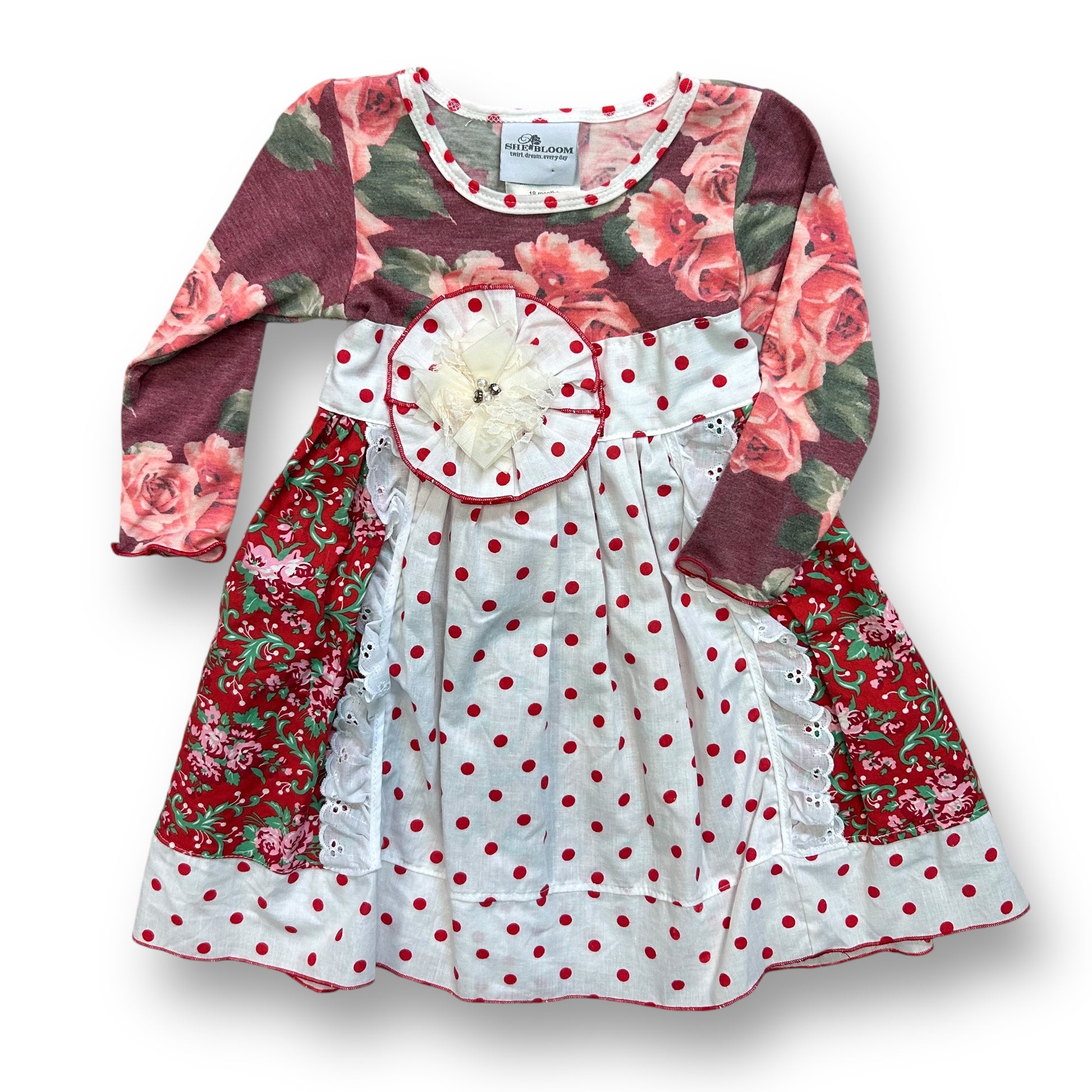 She Bloom Girls Size 18 Months Red Roses & Polka Dots Long Sleeve Boutique Dress